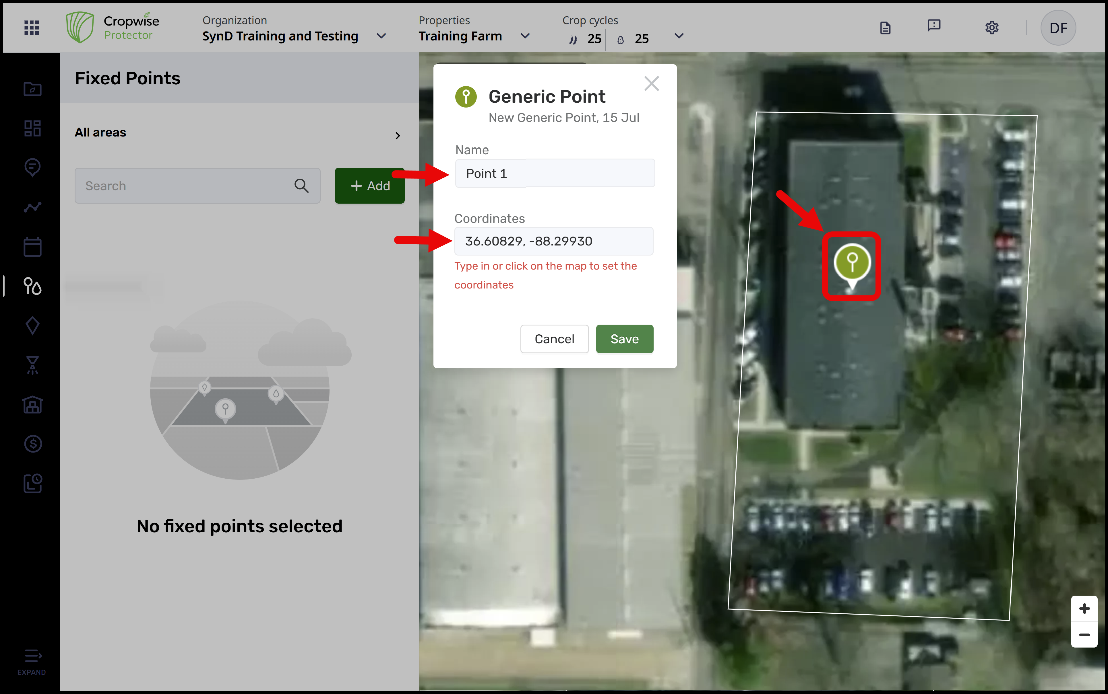 Fixed Points serve as map annotations within the Cropwise Protector organization, offering location markers for specific items. The currently available categories for fixed points include Rain Gauges, Generic Points, and Traps. While Traps can be configured, this functionality is limited to the Cropwise Protector Scouting app. Rain Gauges and Generic Points are also available for creation within the Cropwise Protector Scouting App.