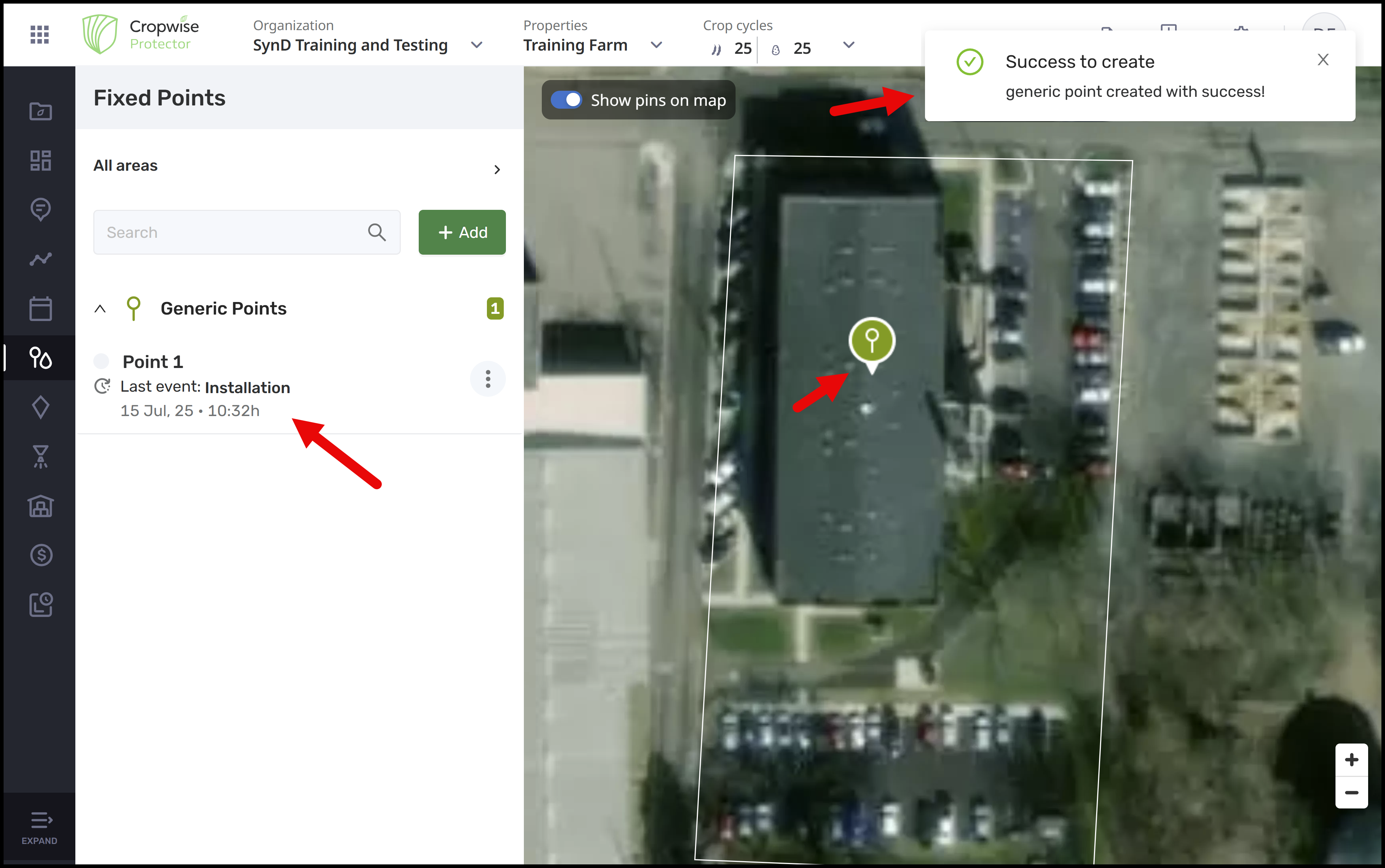 After saving, a success banner will appear in the top right, and the list on the left will start to fill with created points.