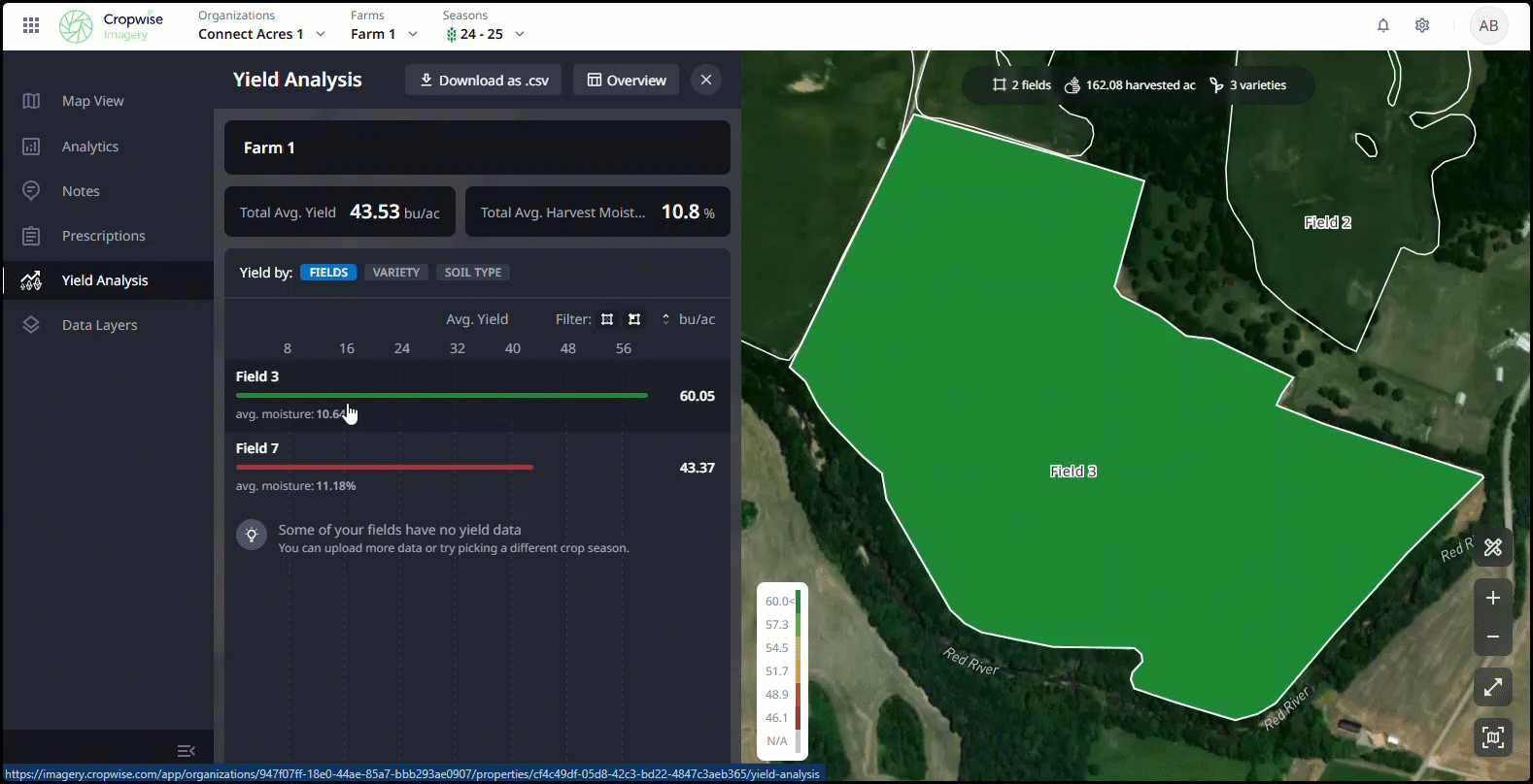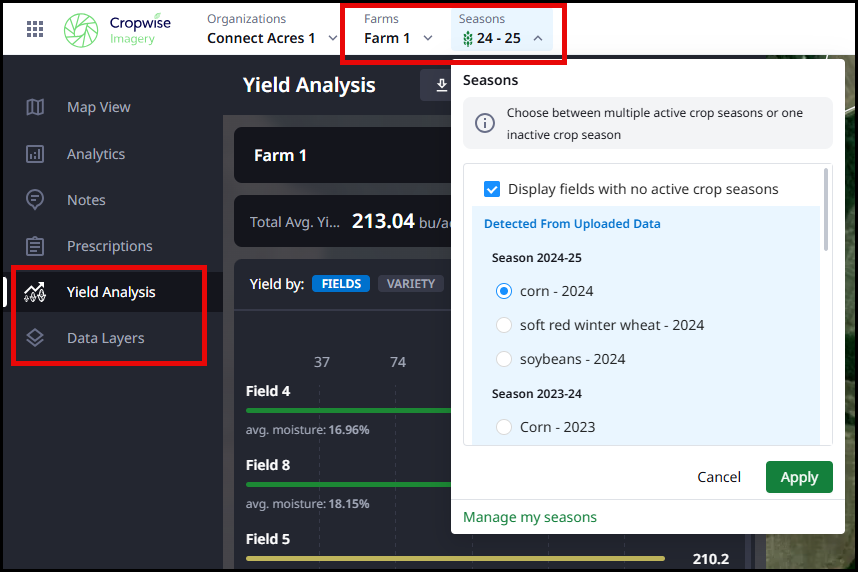 Once the integration is set, it may take 24 hours for the data to process, and will update daily as more data is available from the integration source. After the data is processed it will display on the Yield Analysis and Data Layers tabs. Choose the Farm and the Crop Season to view the data.