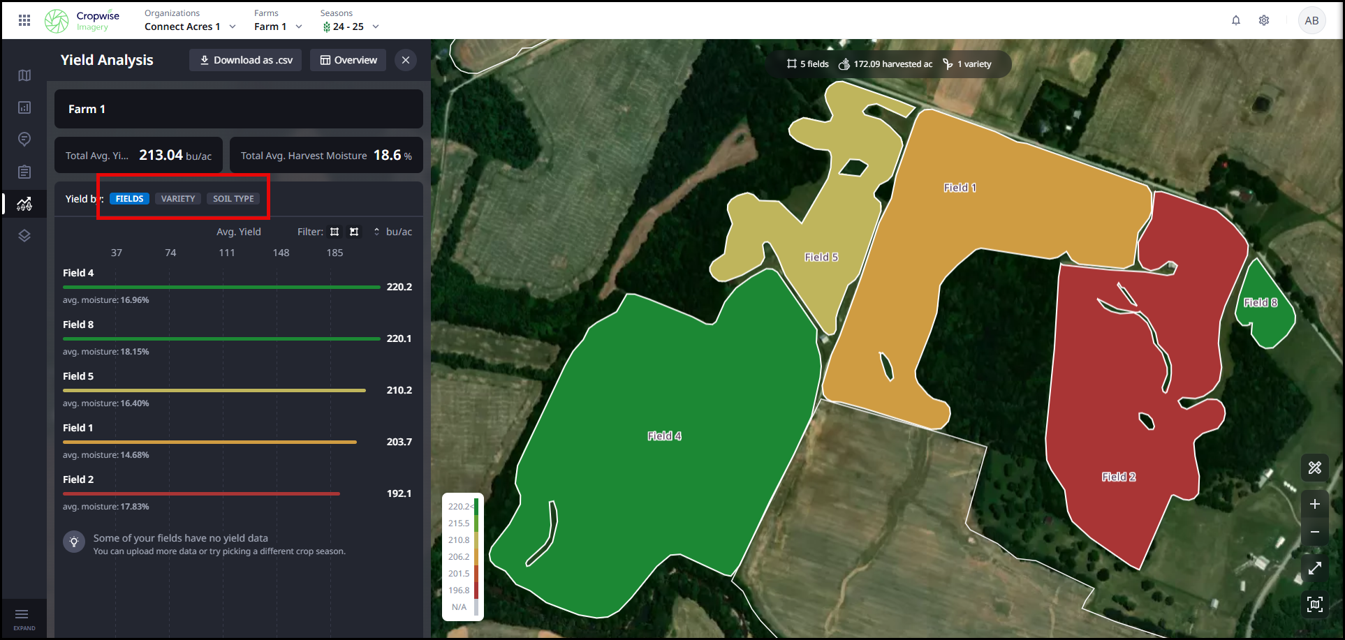 To dive deeper, the yield information can be viewed by Variety or Soil Type in detail.