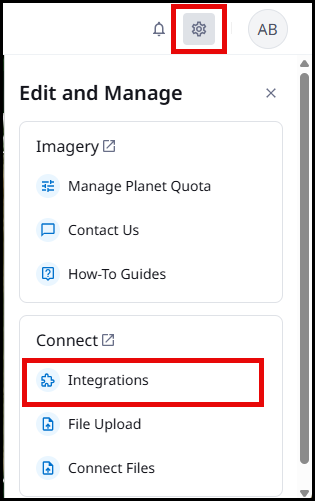 Data Layers uses a Cropwise Connect integration to view and compare spraying and spreading applications, planting and yield data. Cropwise Connect can be used to set up a variety of integrations, such as John Deere, CNH, AgFiniti, Trimble and a direct upload option. To create the integration, log into Cropwise Imagery and select the gear icon in the upper right for options. Select Integrations to choose the source of data to import.