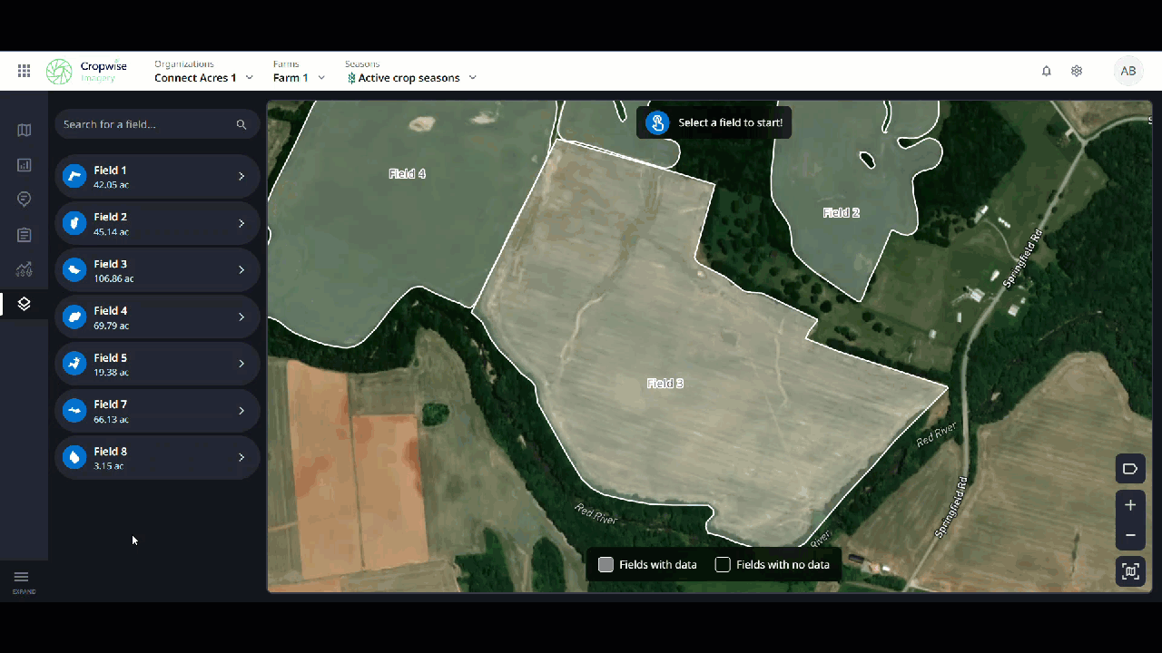 After selecting the field in Data Layers, navigate between the different applications on the field selecting within the application list or using the drop down to swich to a different application. To switch fields , select the Fields drop down at the top, center of the page.